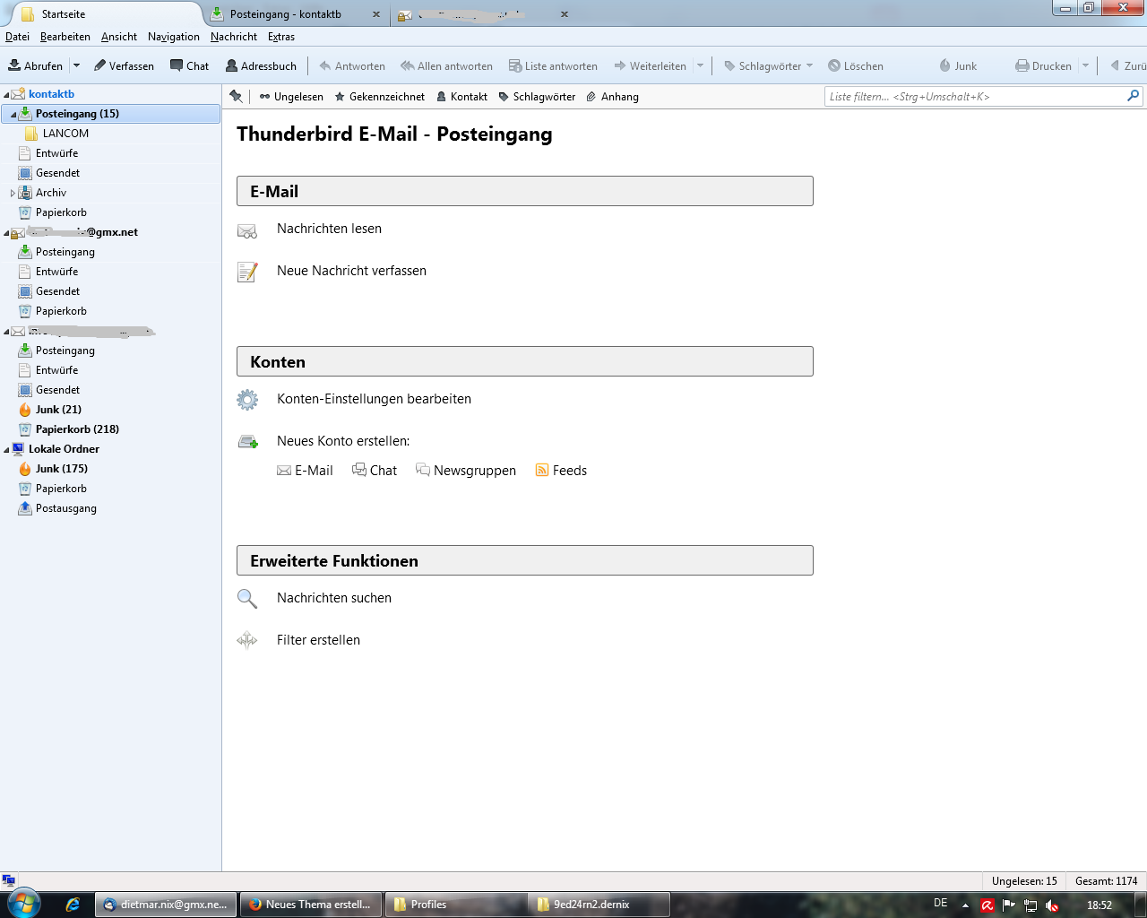 Das erste Profil funktioniert problemlos ... beim zweiten Profil haut die Anzeige nicht hin. Es bleibt jeweils die Startseite "Thunderbird E-Mail Posteingang" erhalten, egal, auf welchen Ordner [z. B. Posteingang oder Gesendet] ich klicke. Die Startseite bleibt einfach stehen.Klicke ich mit rechter Maustaste auf z. B. Posteingang "in neuem Tab öffnen" ... kann ich in dem neuen Tab dann meine Mails lesen.