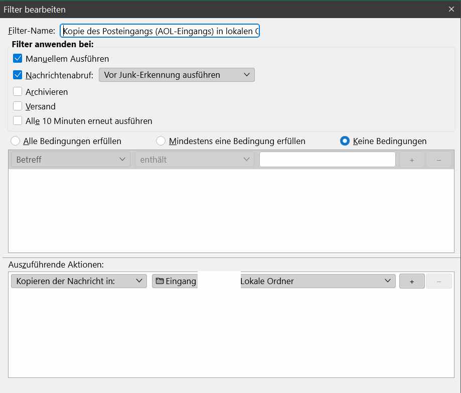 Im Filterprotokoll steht nur das dokumentiert, was ich auch sehe, daß nämlich nur bestimmte Mails den Filter passieren und kopiert werden. Hinweise auf eine Ursache oder Fehler sind dort nicht zu finden.