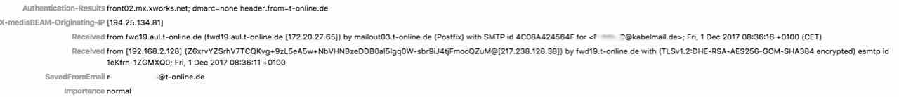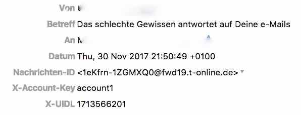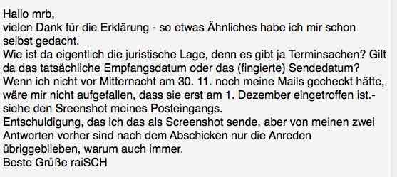 meine Cousine wollte mir vorgestern Abend eine Mail schreiben, aber sie wurde zwei Mal nicht gesendet, sondern blieb im Postausgang. Gestern früh probierte sie es nochmals, und dann ging es. Bei mir ist als Datum aber 30. November 20:15 angegeben, also die Zeit, als erstmals gesendet werden sollte. Nur in den technischen Angaben steht die richtige Zeit unter "Received: