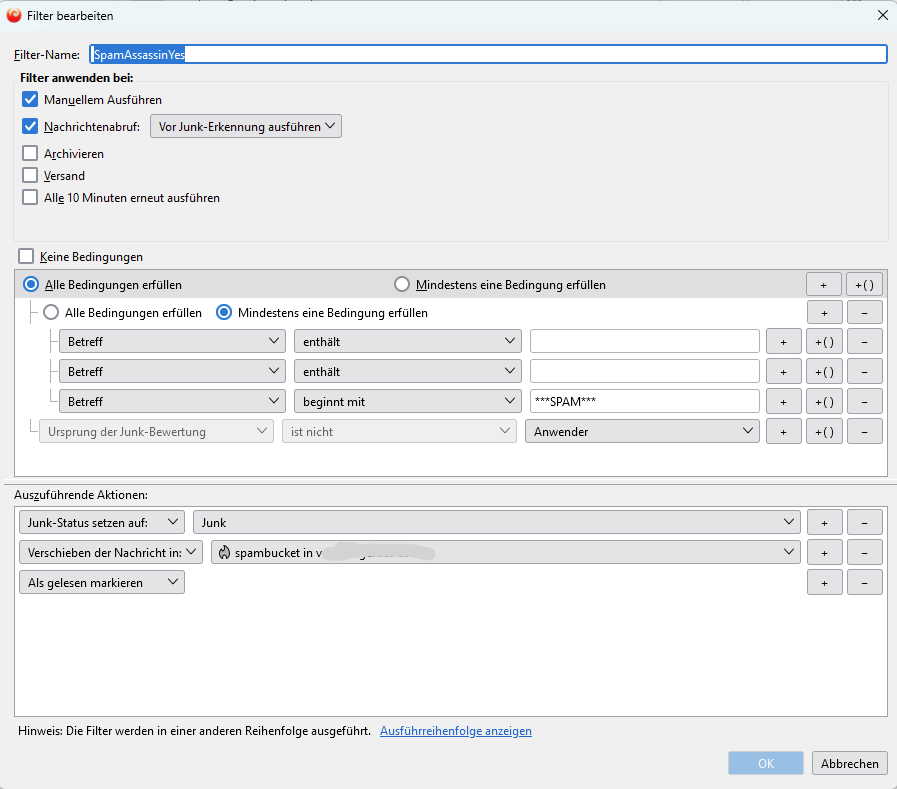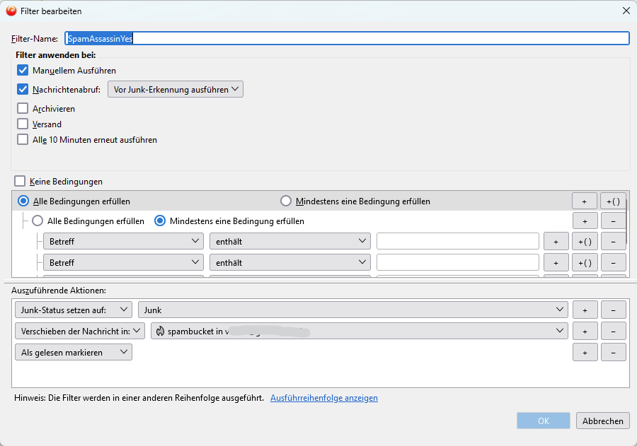 Vom Betterbird-Support erfuhr ich, dass man einen custom-header X-Spam-Status definieren muss, damit der automatisch erzeugte Filter auch funktioniert. Nach deren Angaben war das "schon immer" so, d.h. das System generierte den custom-header nie selbst, so dass der Filter komisch aussah.