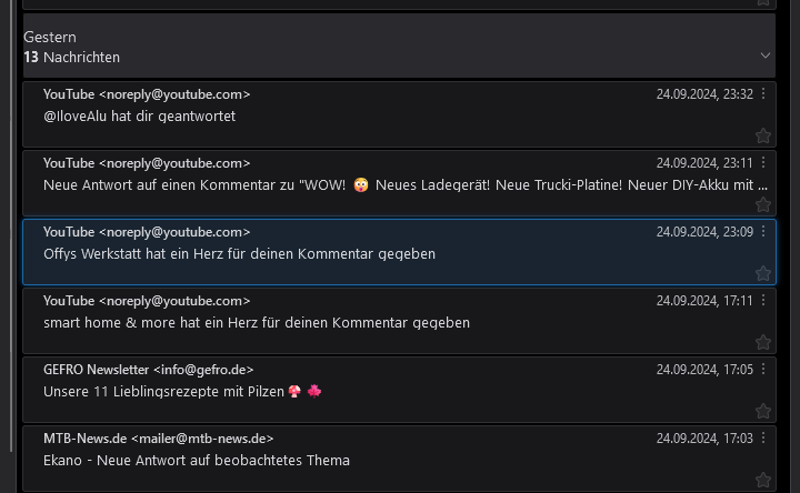 Was mich aber stört ist das jede Nachricht mit der Mailadresse und dem Betrefftext untereinander dargestellt wird und das ist absolut schwierig zu lesen das war früher in einer Zeile.
