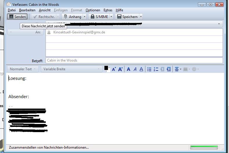 auch wenn ich ein Link aus dem Internet nehme: Beispiel: http://kinoaktuell.de.tl/The-Cabin-in-the-Woods.htm, wenn man dort auf den Link klickt öffnet sich das Fenster und ich drücke auf Senden. Dann passiert ca. 30 Sekunden nichts - Thunderbird reagiert nicht.
