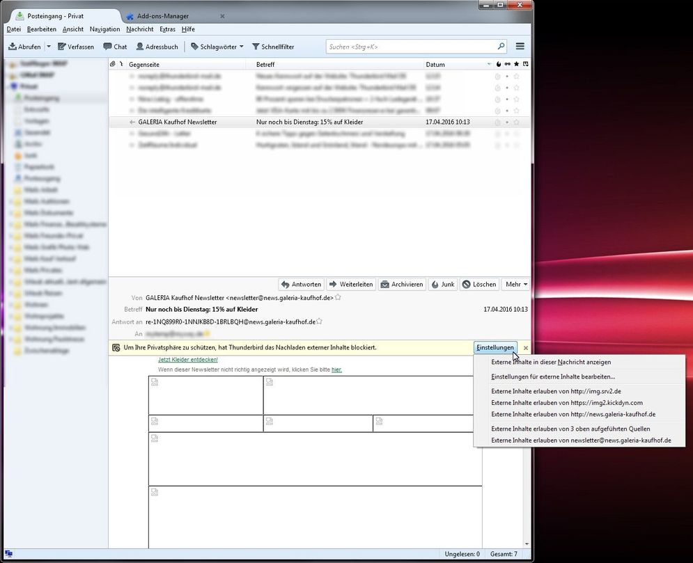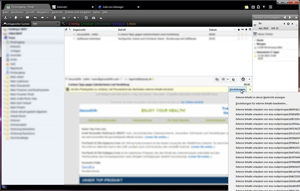 Externe Inhalte erlauben ist in den Einstellungen ausgeschaltet --> beim Anklicken des Buttons "Einstellungen", mit dem man die externen Inhalte einer Mail explizit anzeigen /anschalten kann, erscheint im Fenster eine Liste mit "Externe Inhalte erlauben von moz-nullprincipal:{xxxxxxxxxx"