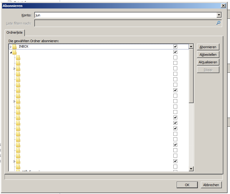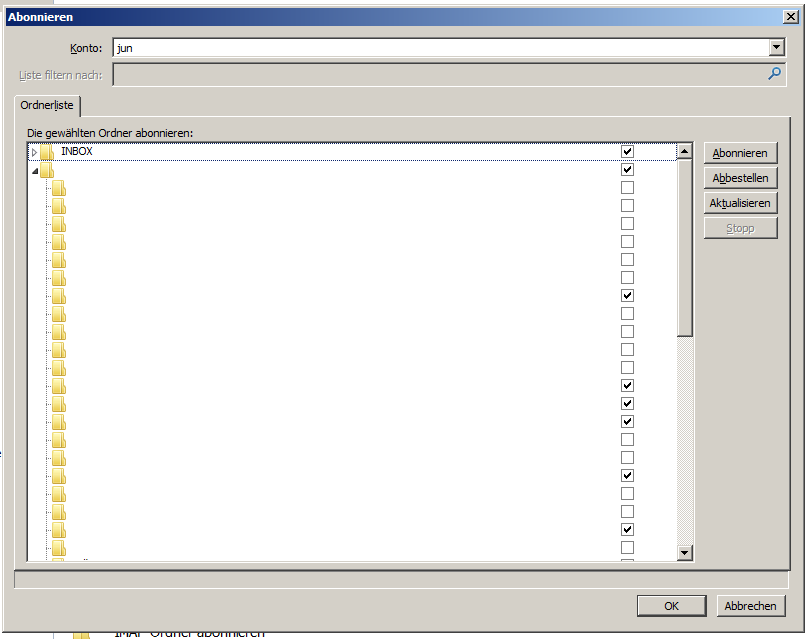 Dann Abonieren --> jetzt wird die komplette Ebene 2 angezeigt und ich kann dort die gewünschten Ordner anklicken.Wenn ich aber alle Ordner der Ebene 2 abgewählt habe, mit OK bestätige und anschließend wieder auf abonieren gehe ist die Ebene 2 wieder komplett weg.