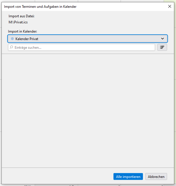 Wenn ich "importieren" anklicke öffnet sich ein Explorer-Fenster, in dem ich die exportierte Datei auswählen soll und zum Schluss auf "öffnen" klicke. Dann kommt eine Seite "Import von Aufgaben und Terminen in Kalender", in der ich den von mir zu aktualisierenden Kalender vorfinde und unten " Alle importieren" betätige. Dann müßte eigentlich der Import ablaufen. Aber bei mir tut sich nichts.