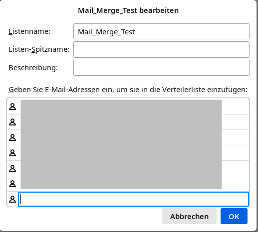 Rechtsklick auf die Verteilerliste (zur Hervorhebung rot umrandet) öffnet das rechts daneben stehende Kontextmenü. Dort Linksklick auf Eigenschaften (zur Hervorbung blau umrandet) öffnet die Verteilerliste, wo Du dann weitere Adressen hinzufügen kannst, Adressen löschen kannst, usw.: