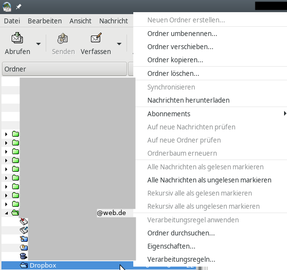 Bei Rechtsklick auf den Hauptordner (oft E-Mailadresse) und Posteingang ist bei mir nur Neuer Ordner im Angebot.