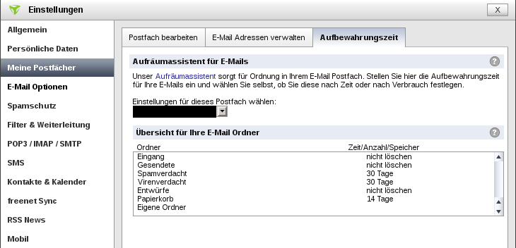 Auch hier musste ich jeweils per WEBMail dort in meinen jeweiligen Kontoeinstellungen die Aufbewahrungszeit auf unbegrenzt ändern.