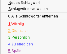 Die Schlagwörter sind sozusagen manuelle Bewertungsinstrumente, mit denen Du einer vorhandenen empfangenen oder gesendeten E-Mail einen besonderen zusätzlichen Status, eine besondere zusätzliche Stellung gibst und womit Du danach dann auch ein weiteres Sortierungs- und Differenzierungsinstrument zur Verfügung hast.