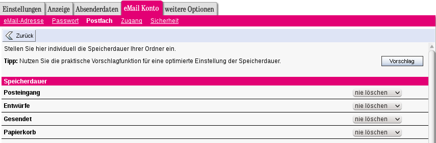 Dann Aufbewahrungszeit der eMails anwählen.