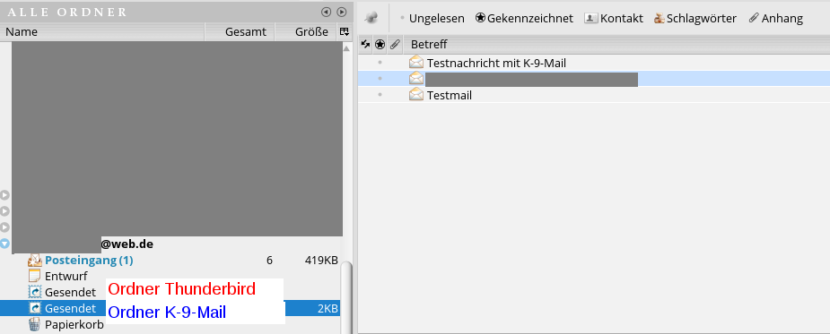K-9 Mail legt einen eigenen "Gesendet"-Ordner an. Wenn Du diesen via Thunderbird abonnierst, dann siehst Du auch im Donnervogel die von K-9 Mail gesendeten E-Mails.Wenn Du Dein WEB.DE-Konto unter K-9 Mail als POP3-Konto angelegt hast, dann taucht der Ordner folgerichtig nicht in WEB.DE bzw. Thunderbird auf.