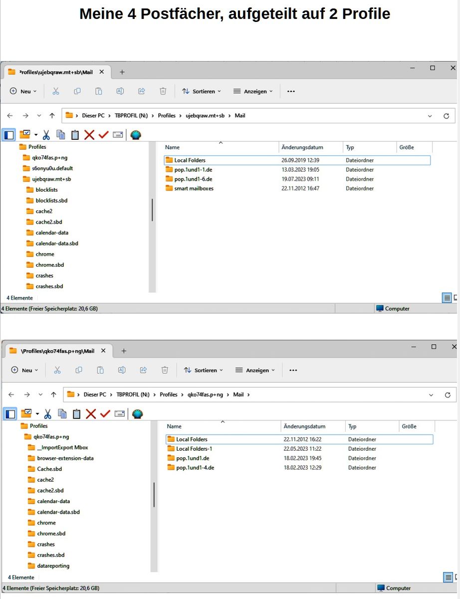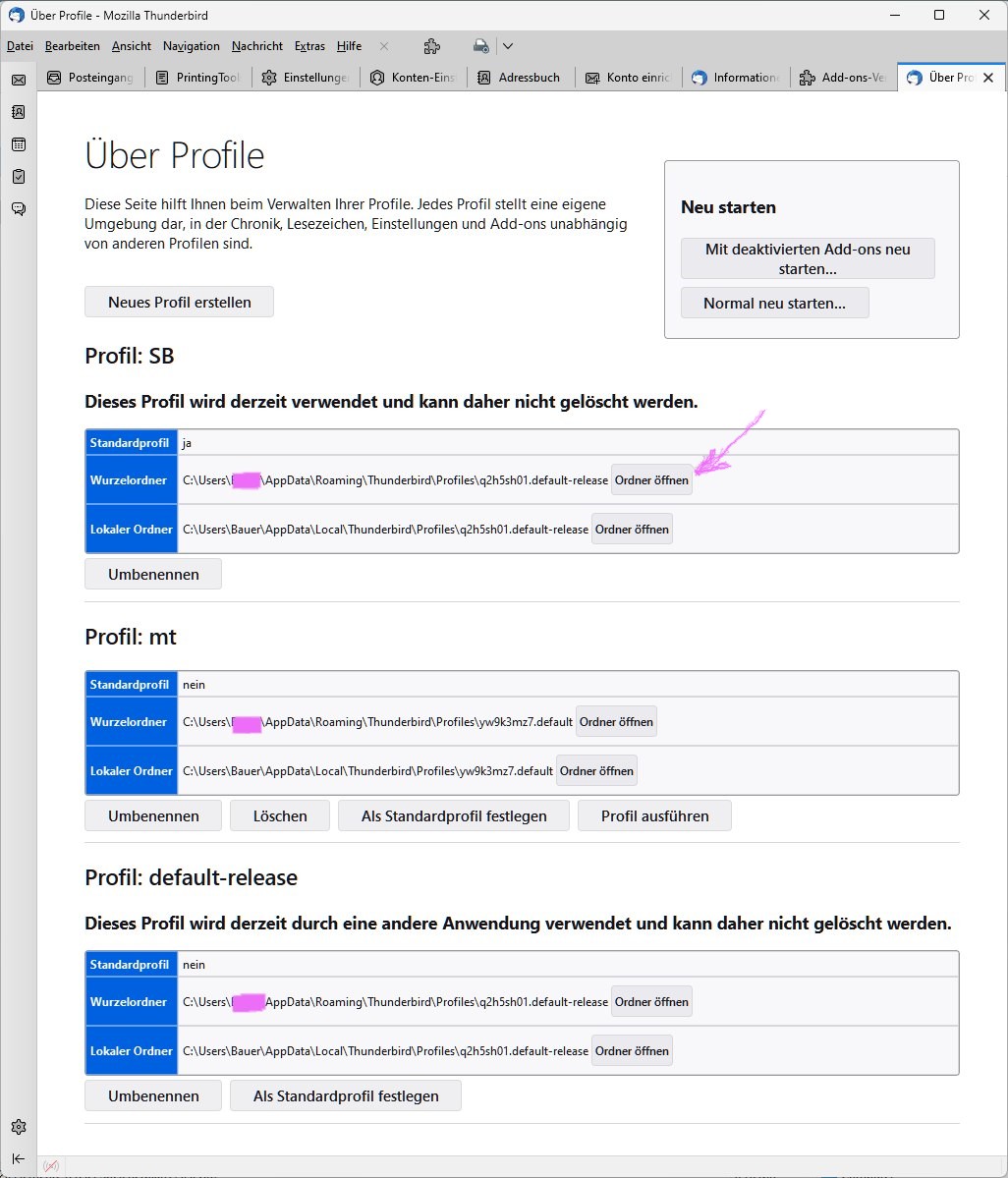 In dem Link Link Profil-Manager - Profile verwalten, erstellen und löschen ist nur der Abschnitt 4 für mein Problem relevant, und der behandelt genau meinen letzten screenshot "Über Profile". Allerdigs haben auch diesmal die "Ordner öffnen"-Knöpfe nur den Explorer gestartet, den ausgewählten neuen Wurzelordner in Laufwerk (N) aber nicht übernommen. Es gab dafür keinen Aktionsknopf.