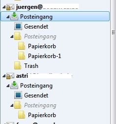 Immer wieder erscheint der Posteingang mit einem Unterordner "Trash" oder "Papierkorb" in TB und bildet sich auch auf dem Server ab. Auch wenn ich ihn überall lösche (glücklicherweise kann ich die von mir angelegten Ordner in der Mail-Administration löschen), ist er beim nächsten Online-Gang im Konto. Ich habe erst im TB erst die IMAP-Abos nachgesehen, die nichtgewünschten abgehakt, die obsoleten Ordner gelöscht, das Löschen in der Servereinstellung auf "sofort löschen" stehen lassen, was mir aber auf Dauer zu gefährlich ist, weil TB keine Bestätigungsabfrage anbietet. Danach die überflüssigen Ordner auf dem Server gelöscht. Irgendwann, nach Minuten, steht im Konto plötzlich wieder ein "Trash" oder "Papierkorb", und zwar als Unterordner eines ausgegrauten Posteingang-Ordners.