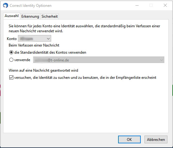 Total genervt habe ich in den Konteneinstellungen von TB herumgewurschtelt. Dabei habe ich bei einem Konto zwei weitere Identitäten hinzugefügt, und schon läuft's wie geschmiert. Mails an diese (zusätzlichen) Identitäten (bei t-online heißen die Inklusivnutzer) landen standardmäßig im Posteingang des Hauptbenutzers). Wenn ich jetzt auf Antworten klicke, wird exakt die Absenderadresse als Empfänger eingetragen und nicht die des Hauptbenutzers.