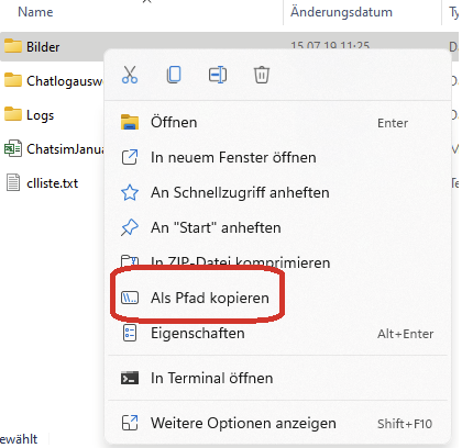 mit Bordmitteln kannst Du Als Pfad kopieren nutzen: