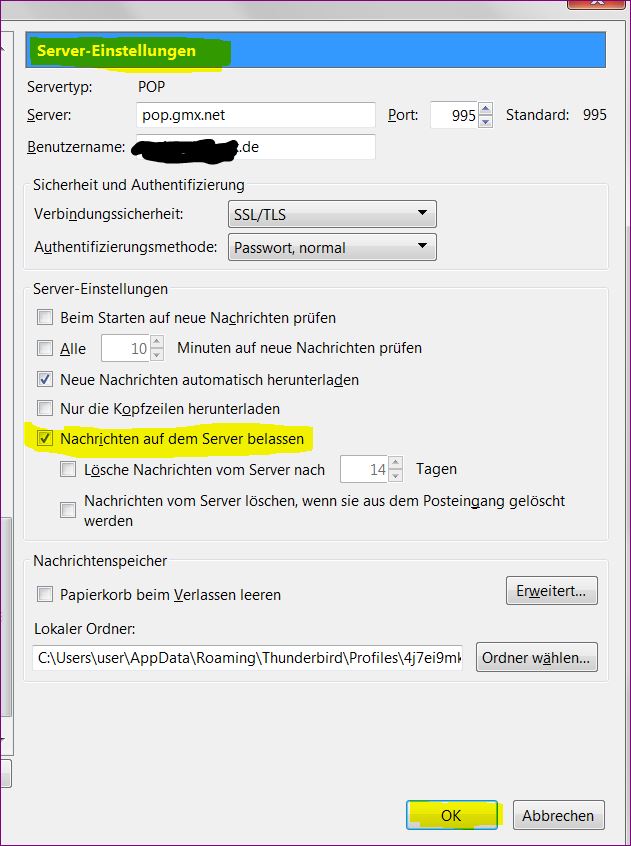 viel Ahnung habe ich ja nicht, aber bei mir sind die Konteneinstellungen wie folgt:Ich rufe also auch über POP ab. Heute über mein Laptop, morgen über den PC, und beide Male kommen die/alle Mails an. Ab und an lösche ich die Mails dann direkt vom Server. Man kann aber auch Zeiten einstellen, wann die alten Mails gelöscht werden sollen.