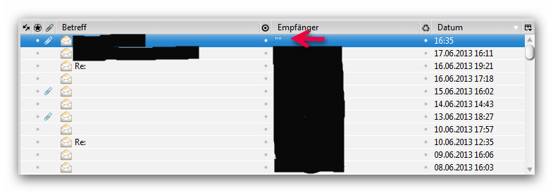 Jetzt zu der eigentlich Frage. Das versenden klappt auch. Sprich, ich bekomme keine Fehlermeldungen, dass sie z.B. nicht zugestellt werden konnte o.ä. Jedoch sagte mir einer der Empfänger, dass er sie nicht bekommen hätte. Von den anderen Empfängern weiß ich das jedoch nicht. Wenn ich mir jetzt diese Mail in dem "Gesendeten Ordner" ansehe, werden unter "Empfänger" keine Emailadressen der ganzen Empfänger angezeigt. Sondern nur Anführungszeichen (siehe Anhang). Gehört das so ? Jetzt weiß ich nicht, ob diese Mail tatsächlich bei allen bzw. überhaupt ankam ??