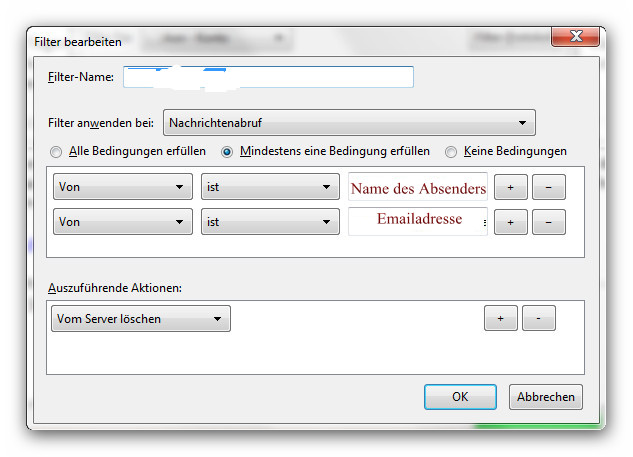 Ich möchte, dass Emails einer bestimmten Person, gleich vom Server gelöscht werden. Dazu erstellte ich für das Aon - Konto einen Filter mit folgenden Angaben (siehe Screenshot). Da aber trotzdem weiter Emails dieser Person heruntergeladen werden, machte ich irgendetwas falsch. Kann mir jemand sagen was ?