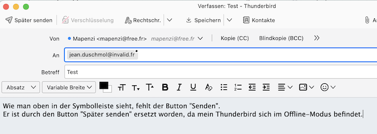 Der Button "Später senden" taucht dann auf, wenn TB offline ist während du eine neue Nachricht verfasst. Ich habe das gerade getestet und der "Senden" Button ist in der Tat durch den "Später senden" Button ersetzt worden: