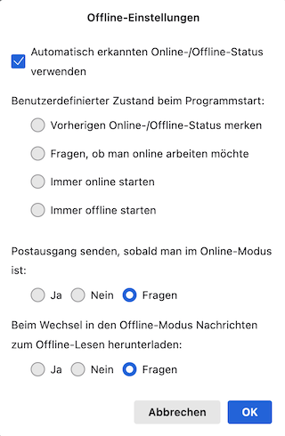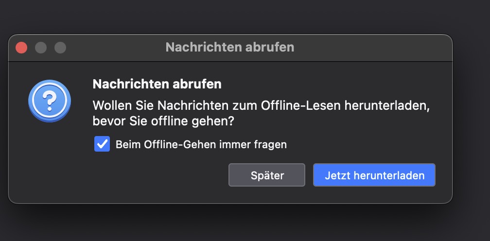 Ich habe die Symbolleiste neu gemacht. Aber wenn ich TB öffne kann ich nicht direkt auf "Abholen" gehen, da passiert nichts. Ich muss erst unten auf dieses kleine Funksignal drücken. Dann fragt er nach dem Kennwort und dann geht es wieder normal. TB scheint auch manchmal von alleine in den "offline" Modeus zu wechseln.