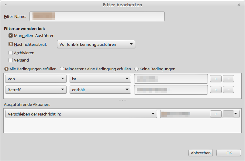 Ich habe mehrere Konten bei einem Anbieter. Für alle diese Konten habe ich Filter mit gleichem Inhalt erstellt. Bis auf genau ein Konto funktioniert auch alles prima. Bei diesem einen Konto wird der Filter weder bei automatischer noch manueller Auslösung angewendet.