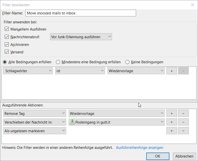 Hat noch mal jemand eine Antwort vom Entwickler bekommen? Ich hatte sie durchgehend im Einsatz. Sogar in der eigentlich nicht kompatiblen Version. Das Zurückschieben hat nie funktioniert, was aber kein Problem war, weil ich es mit einem Filter selbst machen konnte. Aber jetzt habe ich Thunderbird komplett neu eingerichtet, aber nach der manuellen Installation und ein paar Versuchen, stürzt Thunderbird regelmäßig ab oder die Mails werden doppelt und dreifach in den Posteingang zurückkopiert.
