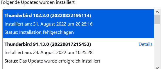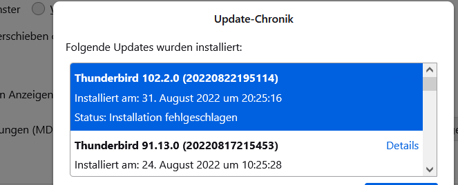 Ich danke Mapenzi für seine kompetente und keine Mühe scheuende Fernhilfe, die einen ganzen Nachmittag beansprucht hat. Sie hat mich vor einem Kontinuitätsbruch bei meiner Mail bewahrt. Die Option automatischer Updates ist jetzt bei mir deaktiviert, so dass ich wieder ein schlichter Anwender ohne Expeditionen in das Labyrinth der TB-Profile sein kann.