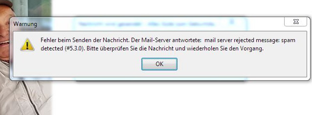 Wenn ich dieselbe mail über das aon-Konto absende, erscheint die Meldung, dass der Server die mail ablehnt wegen Spam 5.3.0.