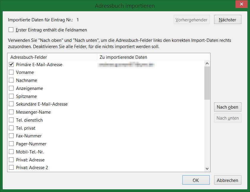 Jetzt habe ich als umständliches Workaround die txt Datei als Adressbuch importiert (muss ich hinterher eben wieder löschen). War aber auch sehr nervig, die ganzen Haken wegzuklicken.