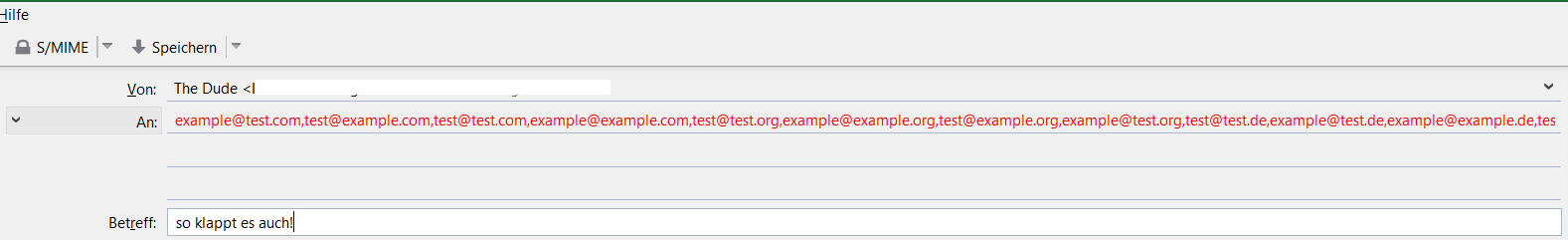 Was ist nun die einfachste Möglichkeit, dies zu bewerkstelligen? Ich habe die Liste schon in einen Texteditor eingefügt und die Zeilenenden wahlweise durch "," ";" "\t" oder "\r\n" ersetzt, aber wenn ich es bei einer neuen Email einfüge, kriege ich immer nur eine lange Zeile. Die Trennzeichen werden nicht erkannt. Gibt's doch irgendwie nicht.