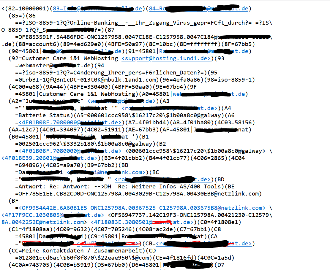 Die Vorschau (3-Spalten-Ansicht) zeigt nichts oder soetwasCode------0856000528163355A41E6B38942B0D2C Content-Type: application/x-pkcs7-signature; name="smime.p7s" Content-Transfer-Encoding: base64 Content-Disposition: attachment; filename="smime.p7s" MIIRrAYJKoZIhvcNAQcCoIIRnTCCEZkCAQExDzANBglghkgBZQMEAgEFADALBgkqhkiG9w0BBwGg gg3pMIIGuzCCBKOgAwIBAgIUe9y7b81NAhnIfUh59PTXFba4NK4wDQYJKoZIhvcNAQELBQAwSDEL MAkGA1UEBhMCQk0xGTAXBgNVBAoTEFF1b1ZhZGlzIExpbWl0ZWQxHjAcBgNVBAMTFVF1b1ZhZGlz ...bei empfangenen imap mails (in dem großen Postfach).