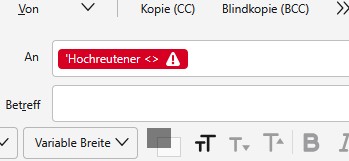 Was geschieht genau: Wenn das Mail in Thunderbird angezeigt wird, sieht man nur den ersten Teil der Empfängeradresse mit dem Hinweis, dass es sich nicht um gültige Adresse handelt. Der Rest, Betreff und Meldung fehlen.