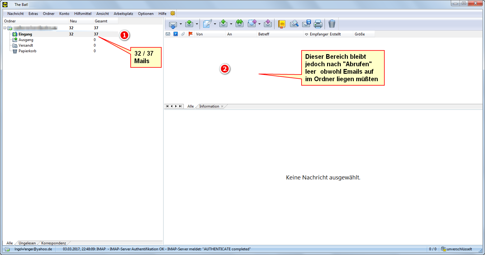 Hier sind noch 32 Mails (TheBat! (Bild 4) zeigt sogar 37 gesamt an) verblieben, die sich mit keinem der 3 Programme anzeigen oder herunterholen lassen.