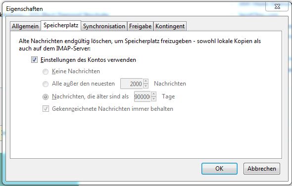 1) Ich verstehe nicht, weshalb automatisch alle Emails nach einer bestimmten Zeit in Thunderbird in Windows 7 gelöscht werden, obwohl ich meine, dass die Einstellungen die gleichen wie in Thunderbird in Snow Leopard sind: Eigenschaften, Speicherplatz, Einstellungen des Kontos verwenden, Keine Nachrichten (siehe Screenshot)