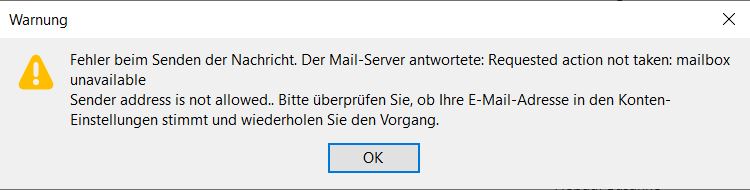 Obwohl ich vorher alles von diesem Konto in Thunderbird wirklich löschte, auch den Postausgangsserver, war die Fehlermeldung immer noch da. Erst jetzt ist wieder alles, wie es sollte.