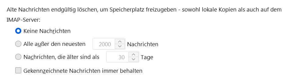 Missverständnis: Es nützt mir nichts, wenn ich alle Mails archiviere. Ich muss noch damit arbeiten, also in Unterordner aufteilen etc. Über den Browser logge ich mich ein. Ist es über Thunderbird nicht möglich, wie ich zu Beginn gefragt habe, die Mails zu behalten, während sie auf dem Server gelöscht werden? Aus den Einstellungen bei Thunderbird werde ich nicht schlau: