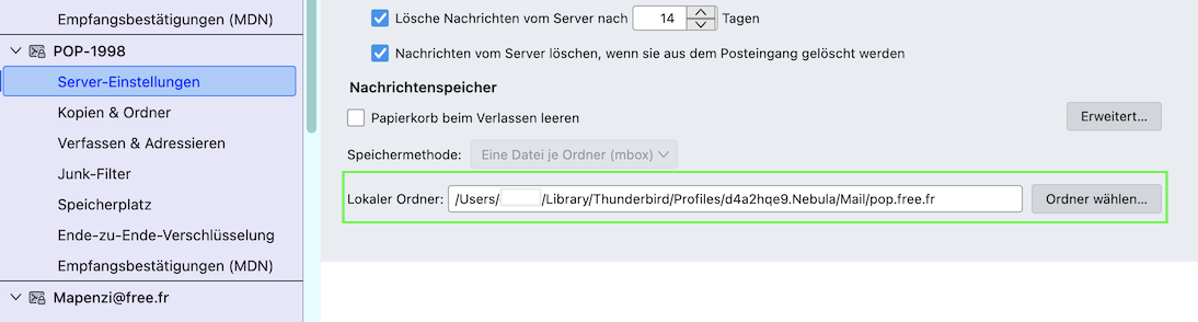 Jetzt brauche ich doch in den Server-Einstellungen des neu angelegten Kontos nur den Pfad umstellen, damit er zu meinen alten Kontenordner pop.free.fr lautet.