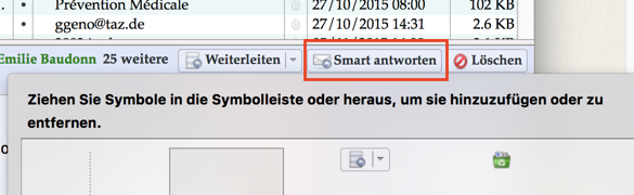 Ergänzend noch ein screen shot mit der automatischen Anpassung des Mehrzweck-Buttons "Smart antworten" im Falle einer Mail, die über eine Verteiler-Liste empfangen wurde: