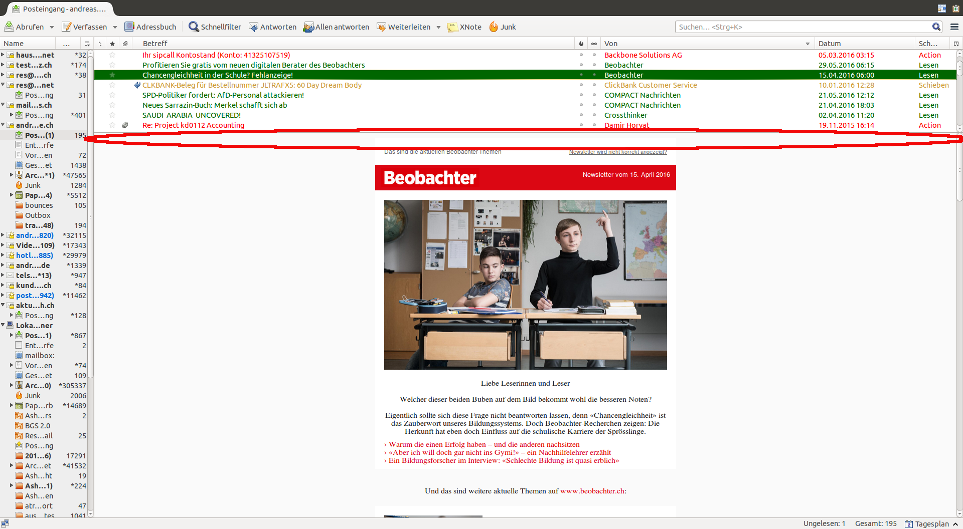 Seit längerem sehe ich links in der Auflistung der Konten und Folder einen Posteingang fett markiert mit einer (1) am Ende. Doch im Folder (auch in den Unterfoldern) finde ich die erwartete ungelesene eMail nicht.