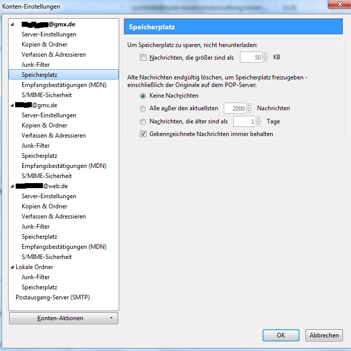 1) TB löscht (scheinbar) nach einer Zeit die alten E-Mails, die auf meinem PC gespeichert sind. Auf dem Server (von z.B. Web.de) sind sie trotz POP3 noch gespeichert.