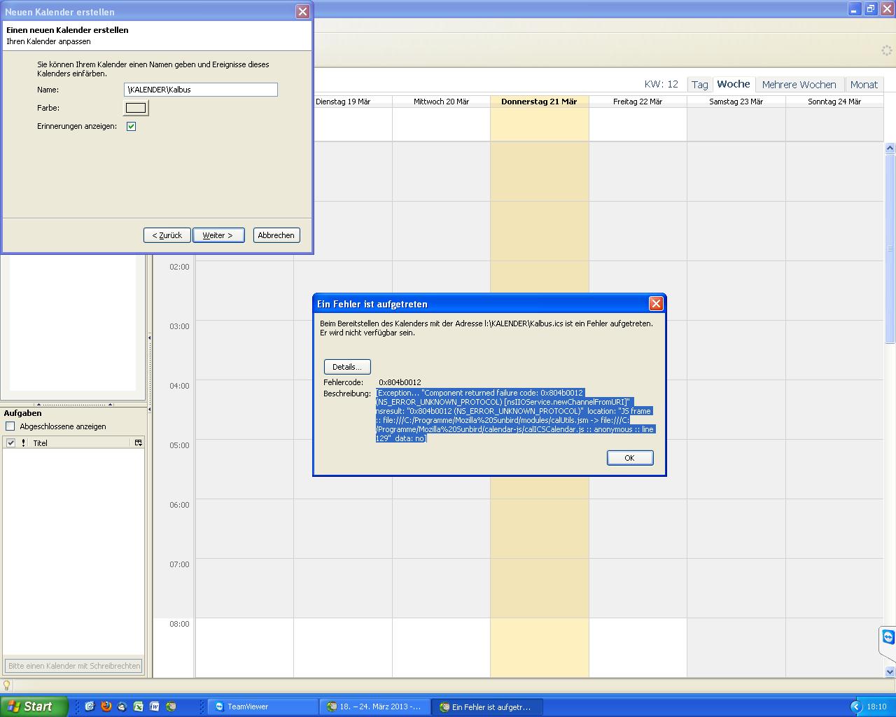 Hallo, seit einiger Zeit komme ich auf den Kalender der im Netzlaufwerk liegt nicht mehr rauf. Habe bereits Sunbird erneut installiert aber während ich das Netzlaufwerk den Kalender ort angebe, erhalte ich eine Fehlermeldung, diesen habe ich als Screen beigefügt.