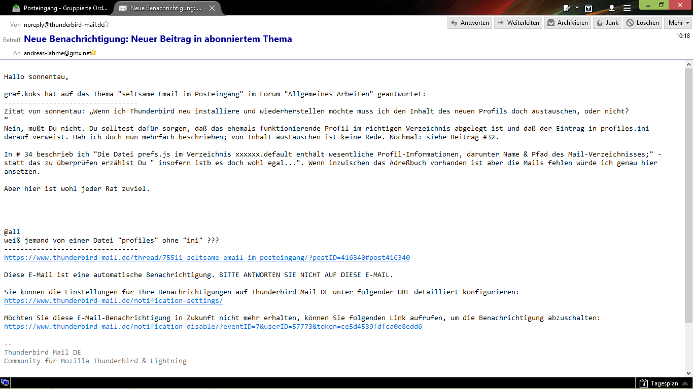 In Beitrag #9 beginnt ja das ganze Dilemma!Sonnentau hat versehentlich "im Profil etwas gelöscht" und danach "fand Thunderbird das Profil nicht mehr", wie er es beschreibt.