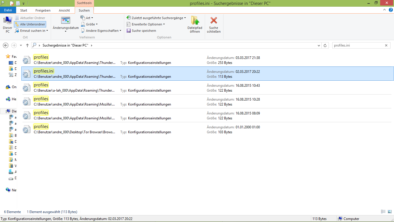 Verzeichnis C:\Users\Name\AppData\Roaming\Thunderbird\ enthält die Datei profiles.ini, in welcher der Verweis auf
