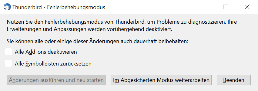 Im Fehlerbehebungsmodus tut sich nach Anklicken von "Änderungen ausführen und neu starten" nichts, s. screenshot
