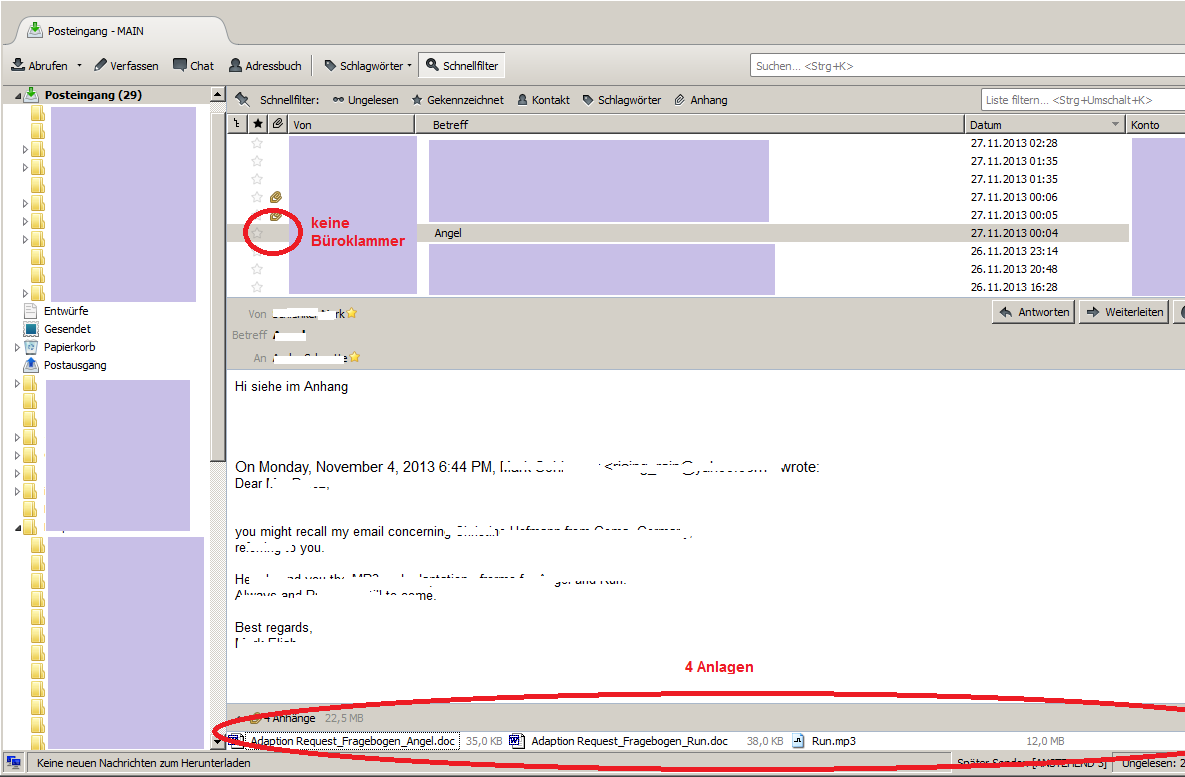 In der Email-Übersicht werden manchmal keine "Büroklammer-Symbole" eingeblendet, obwohl ein Anhang an der EMail vorhanden ist (hier im Beispiel POP3 Konto von GMX). Da ich oft nach EMails Suche und sehr viele Emails erhalte kann ich durch sortierung nach Anhang oder nicht oft vieles ausgrenzen. In diesem Fall klappt es aber nicht.