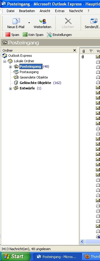 Ich danke euch erst einmal für eure Hilfe. Ich muss jetzt aber feststellen, dass ich die positiven Meinungen über TB nicht teilen kann und auch mit dem Programm überhaupt nicht warm werde. Es dauert einfach viel zu lange bis die Mails abgerufen werden und auch wenn der Hinweis unten rechts erscheint, dass Mails eingegangen sind, geht es selbst nach dem Öffnen der Mails erst weg, wenn man das Programm neu startet. So habe ich mir das nicht vorgestellt. Ich werde schauen, ob ich ein vergleichbares Mailprogramm zum OE bekomme, was mich allerdings zweifeln lässt, weil er einfach einfach ist und meine wenigen Bedürfnisse mehr als gut erfüllt. Mir ist es egal, ob das Programm alt ist. Ich hatte noch nie Probleme in den jetzt mehr als 10 Jahren, im Gegensatz zum TB, der mich sehr enttäuscht hat.