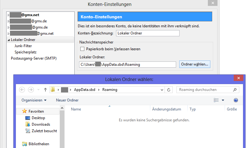 Ist das vllt das Archiv? Dort kann ich allerdings nicht den Pfad mit dem Archiv einstellen... (Ich komme mit dem Browser bis "AppData" und dann wird mir ein leerer Ordner angezeigt... das war auch vorher das Problem, dass ich den Roaming-Ordner nicht gefunden habe. Über die Thunderbird-Funktion findet sich der Ordner allerdings)