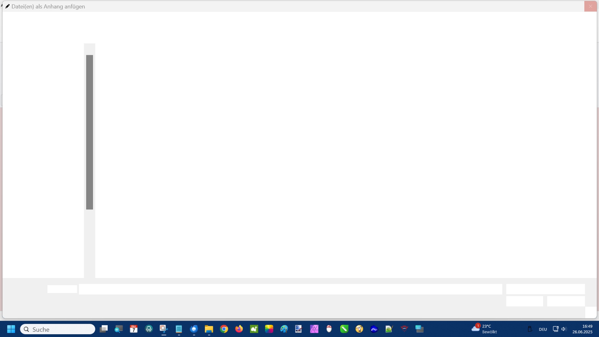 wenn ich in einer E-Mail einen Anhang, z. B. ein Bild versenden will und auf "Anhängen" klicke, bekomme ich seit heute nur noch ein weißes Fenster, auf dem oben in blassgrau steht: Datei(en) als Anhang einfügen.