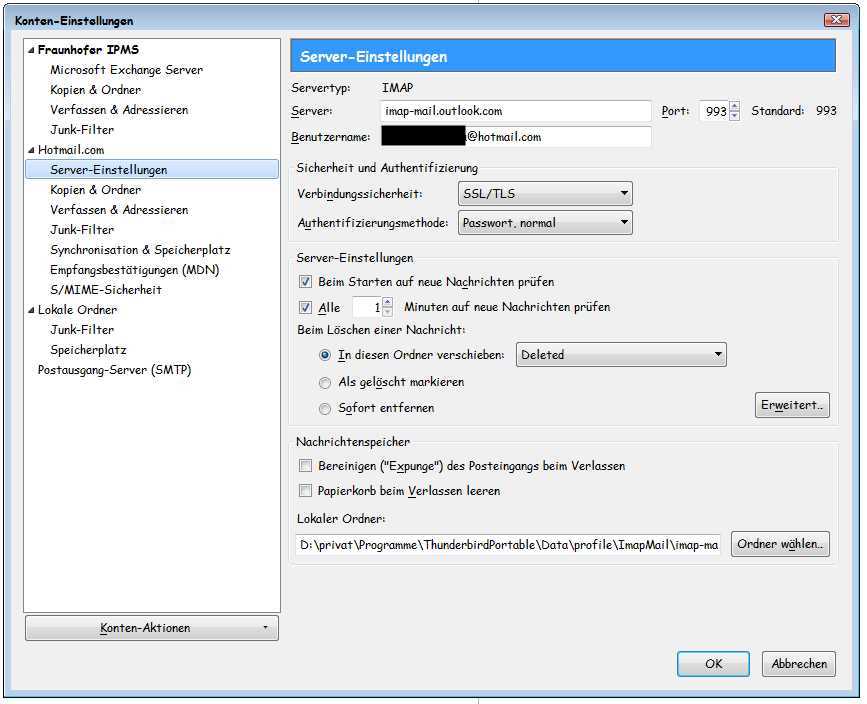 Ich hab ja irgendwie die Befürchtung, daß die Ordner auf den Servern anders heißen als ich sie angezeigt bekomme und TB sie deswegen nicht finden kann. Der Ordner der in Outlook "Gelöschte Elemente" heißt, heißt in TB "Deleted". Das is der einzige Ordner der einen englischen Namen hat. Das macht mich stutzig.