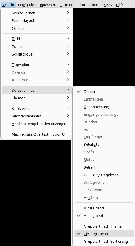Screenshot von der fraglichen Einstellung. Darum geht es mir, dass die dort gesetzte Einstellung dauerhaft bleibt und nicht andauernd duch "Gruppieren nach Thema" geändert wird, ohne dass ich irgendwas mache (Außer Empfang von Mails in Posteingang)